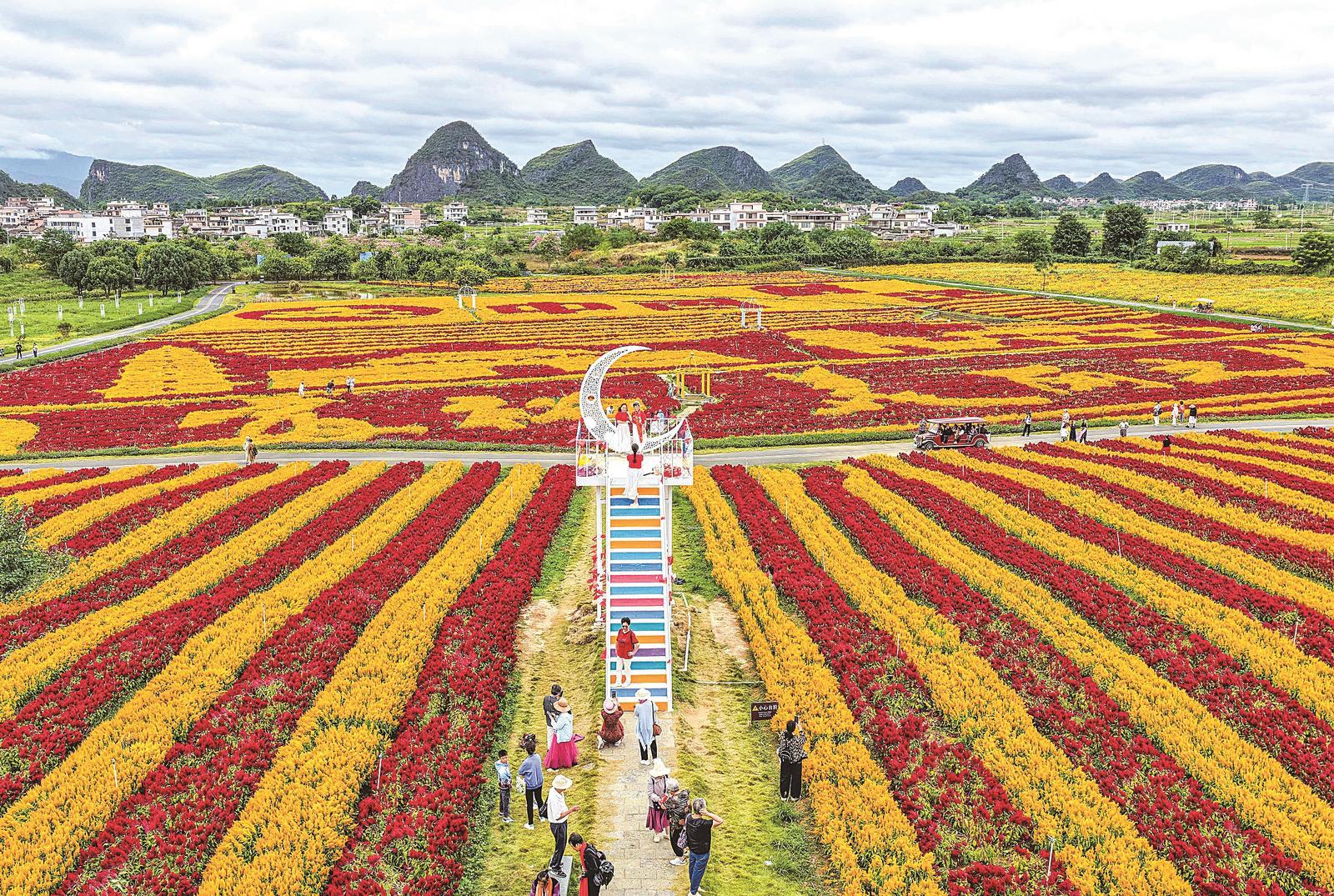 近年来,广西贺州富川瑶族自治县依托丰富的花卉资源,打造赏花节、赏花旅游线路,以花为媒的“赏花经济”蓬勃发展,成为拉动文旅消费的新引擎。图为10月19日富川瑶族自治县神仙湖慢城花海景区色彩斑斓、秋景迷人,吸引众多游客赏景游玩、亲近自然。视觉中国 供图