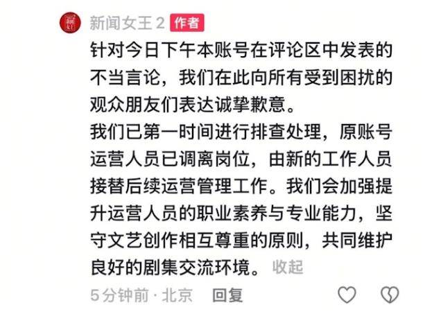 该言论引发网民争议,最后《新闻女王2》对此公开道歉:“针对本账号在评论区中发表的不当言论,我们在此向所有受到困扰的观众朋友们表达诚挚歉意。我们已第一时间进行排查处理,原账号运营人员已调离岗位,由新的工作人员接替后续运营管理工作。我们会加强提升运营人员的职业素养与专业能力,坚守文艺创作相互尊重的原则,共同维护良好的剧集交流环境。”
